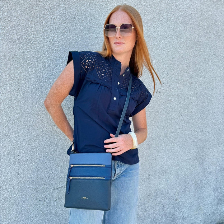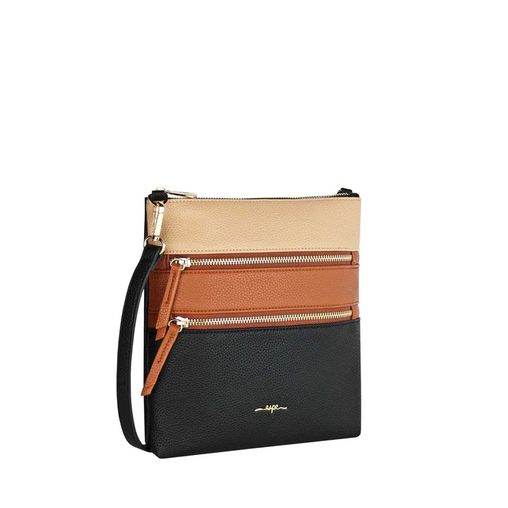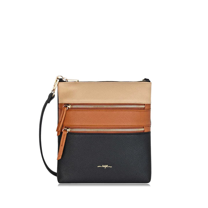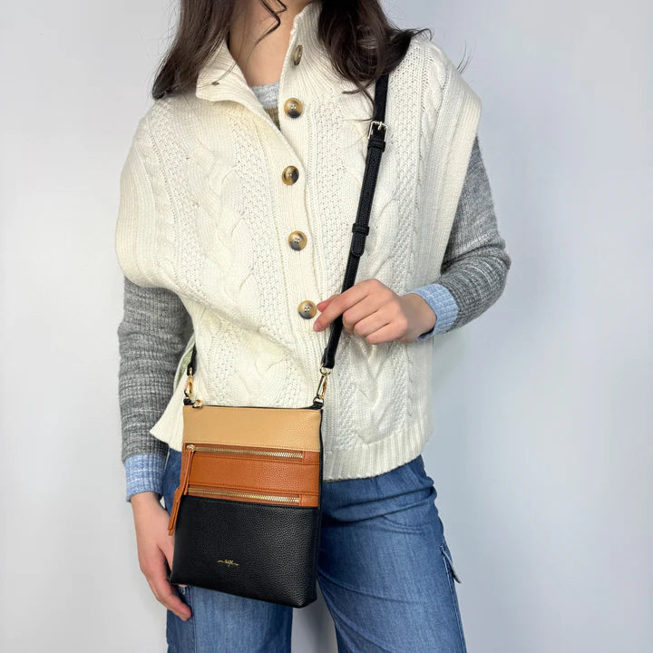 The Jenn is a medium size cross body bag perfect to store all your necessities with multiple compartments for organization. The Jenn is stylish and made from soft pebbled vegan leather. The triple tone look brings some fun to your wardrobe.